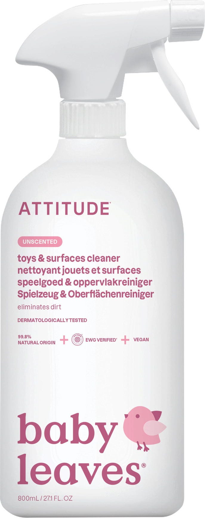 Čistilo za igrače ATTITUDE ne vsebuje kemikalij, ki bi lahko bile škodljive za otroke. Ne vsebuje dišav, je hipoalergeno in se lahko uporablja tudi na gladkih površinah.