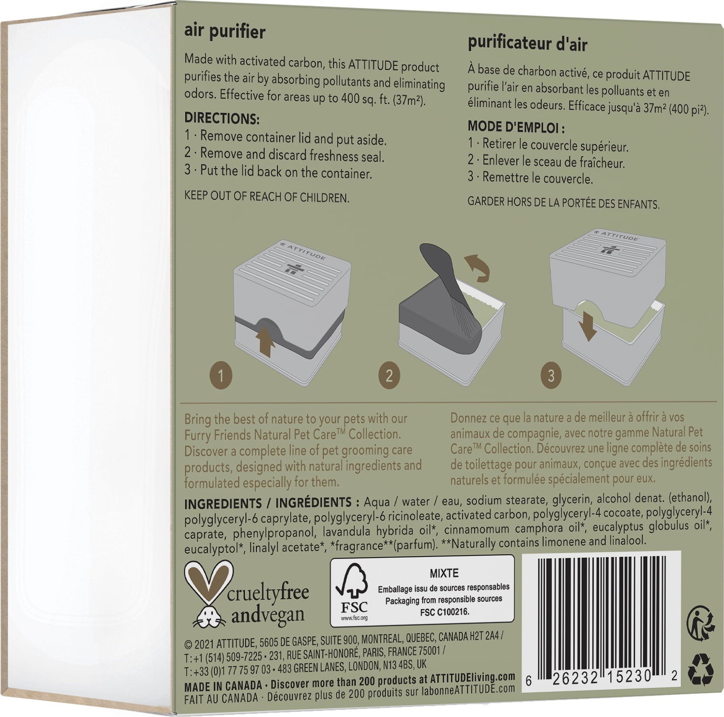 Zahvaljujoč temu odstranjevalcu vonjav lahko vi in vaši štirinožni prijatelji enostavno zadihate. Izdelek vsebuje aktivno oglje, ki absorbira umazanijo iz zraka, smola pa nevtralizira slabe vonjave. Zahvaljujoč nežni aromi sivke je tudi zrak v prostoru prijetno osvežen.
