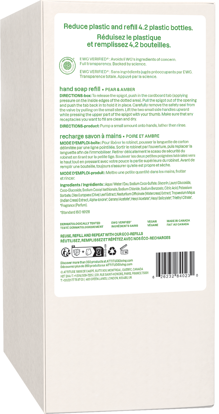 Hipoalergensa formulacija tega mila za roke vsebuje antioksidantivni izvleček oljčnih listov, ki kožo navlaži, blago rastlinsko površinsko aktivne snovi pa jo nežno očistijo. S prijetnim vonjem hruške in ingverja.