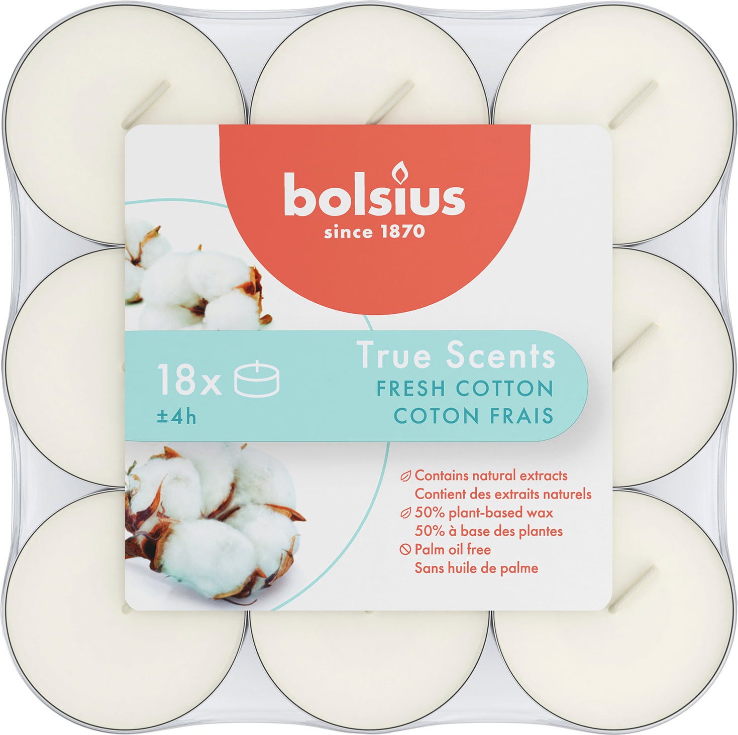 Dišeče čajne svečke True Scents znamke Bolsius v vašem domu oddajajo nežen vonj. Sveče so obogatene z naravnimi izvlečki, ne vsebujejo palmovega olja in zagotavljajo optimalno sproščanje vonja do 4 ure.