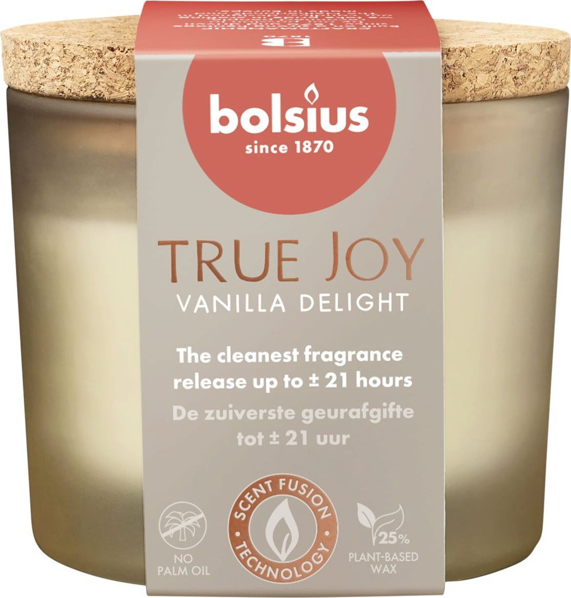 Naj vas očara nežna dišava True Joy dišeče sveče znamke Bolsius. Dolgotrajno sproščanje dišave, ki traja do 21 ur, ustvari popolno vzdušje dobrega počutja v vaših bivalnih prostorih. Sveča je delno izdelana iz rastlinskega voska in ne vsebuje palmovega olja.