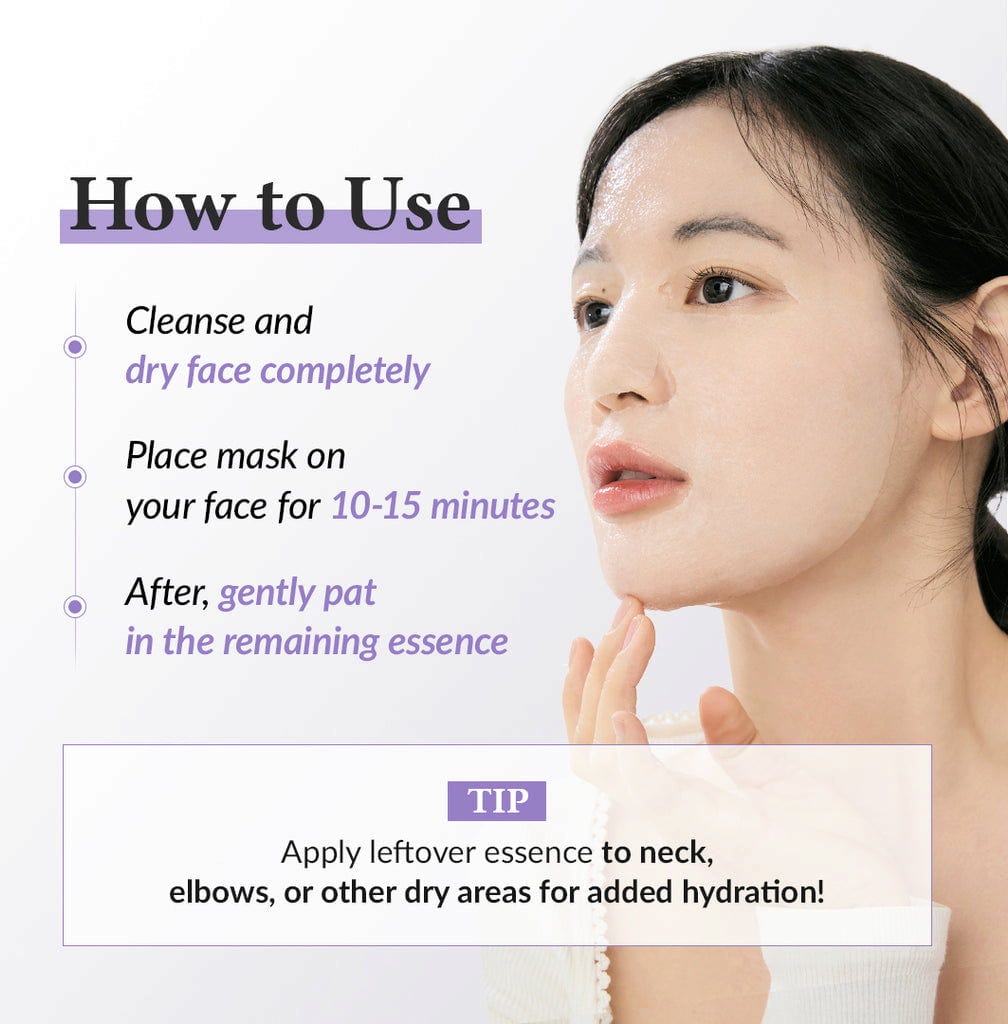 | Uporaba: | Masko za obraz v robčku položite na očiščen obraz. Po 10 do 15 minutah delovanja masko odstranite z obraza in v kožo nežno vmasirate ostanke maske, dokler se popolnoma ne vpijejo. Nato nanesite želeno kremo za obraz. |