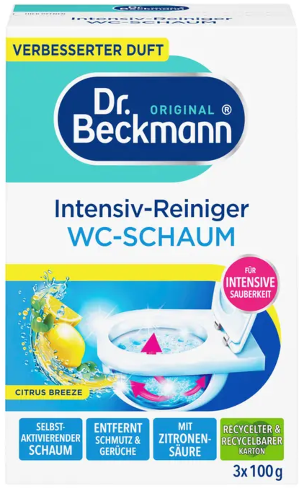 Intenzivna čistilna pena za WC znamke Dr. Beckmann prejmete v obliki prahu, ki se ob stiku z vodo spremeni v aktivno čistilno peno.