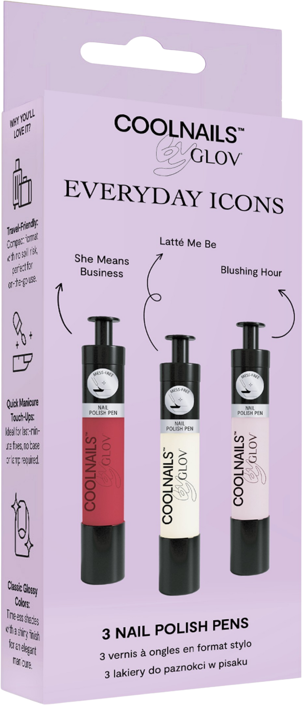 Komplet Everyday Icons znamke GLOV zagotavlja, da bodo vaši nohti vedno videti popolni. Vsebuje tri lake za nohte v briljantnih barvah, ki jih je izjemno hitro in enostavno nanesti, tudi na poti. Laki se hitro sušijo in so popolni za zadnje popravke ali spontani glamur.