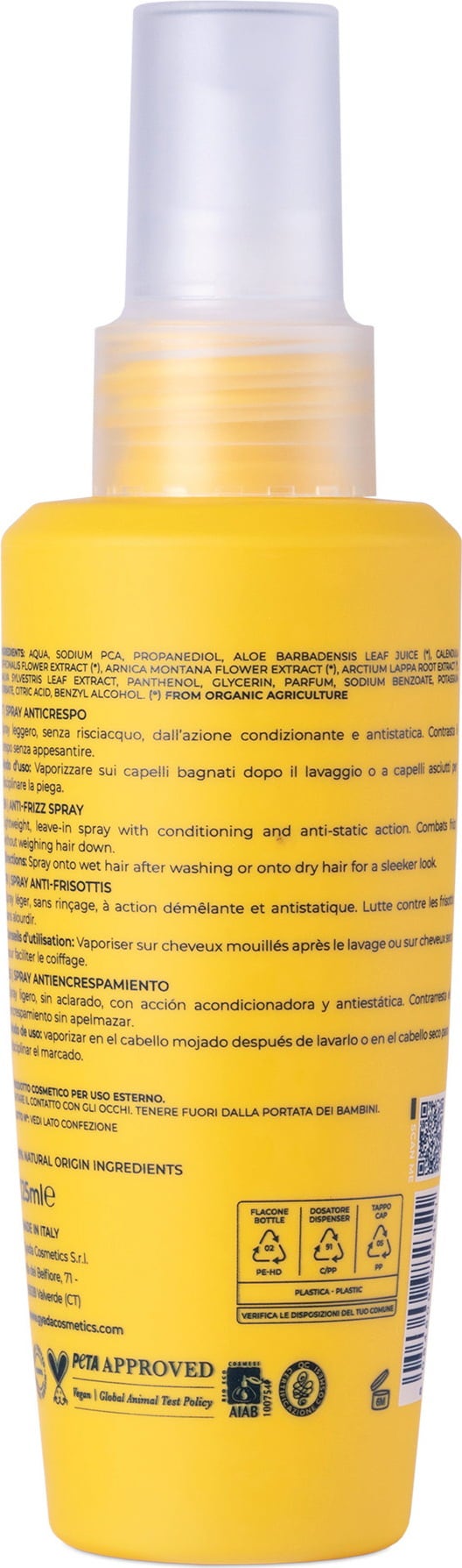Zaradi svoje inovativne, sveže in nežne formule je Anti-Frizz sprej idealen za oblikovanje in regeneracijo razcepljenih in preobremenjenih las - ravne in kodraste. Vsebuje mešanico bio-zeliščnih izvlečkov, ki imajo anti-statični in negovalni učinek in dodatno ne zlepljajo ter obremenjujejo las. Poleg tega podarijo naraven sijaj in zaščito pred zunanjimi vplivi.