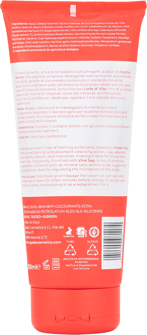 Čistilna krema na osnovi zelene gline ne vsebuje penečih tenzidov in očisti lase na nežen način. Visoka vsebnost mineralov vpije prekomeren sebum in je popolna za vse, ki pogosto umivajo lase. Receptura je bila obogatena z grozdnim sokom, mineralnimi solmi, aminokislinami, sladkorji in polifenoli. Za popolno čiščenje mikrobioma, povečajte prožnost las in preprečite lomljenje las. Fermentiran rižev hidrolat lase vlaži in zmanjša zvit učinek kodrastih las.