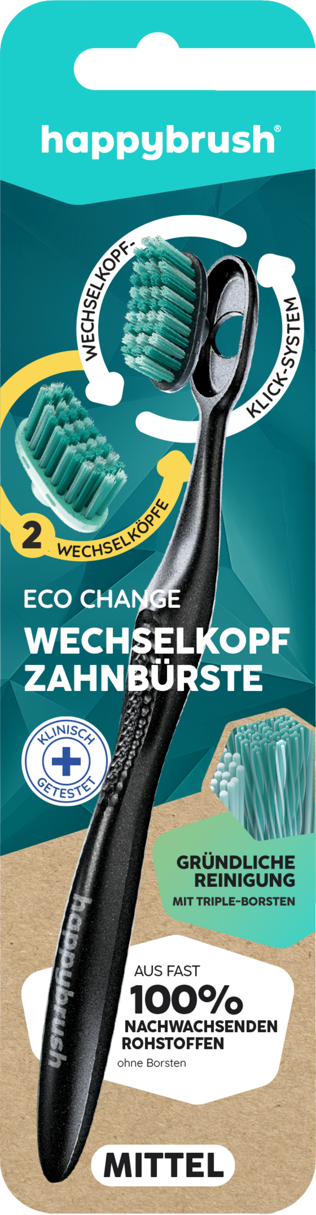 Z ročno zobno ščetko Eco Change znamke happybrush je okolju prijazna ustna higiena otročje lahko. Poleg visokokakovostnih trojnih ščetin je zobna ščetka izdelana iz obnovljivih surovin, proizvodnja ščetk pa poteka v Nemčiji. Srednje trda glava ščetke nežno in temeljito očisti dlesni in zobe. Ergonomski ročaj zagotavlja optimalno rokovanje in ga lahko uporabite večkrat. Praktičen sistem zamenljivih glav vsako leto prihrani veliko količino plastičnih odpadkov in poskrbi, bolj okoljsko ozaveščen življenjski slog.