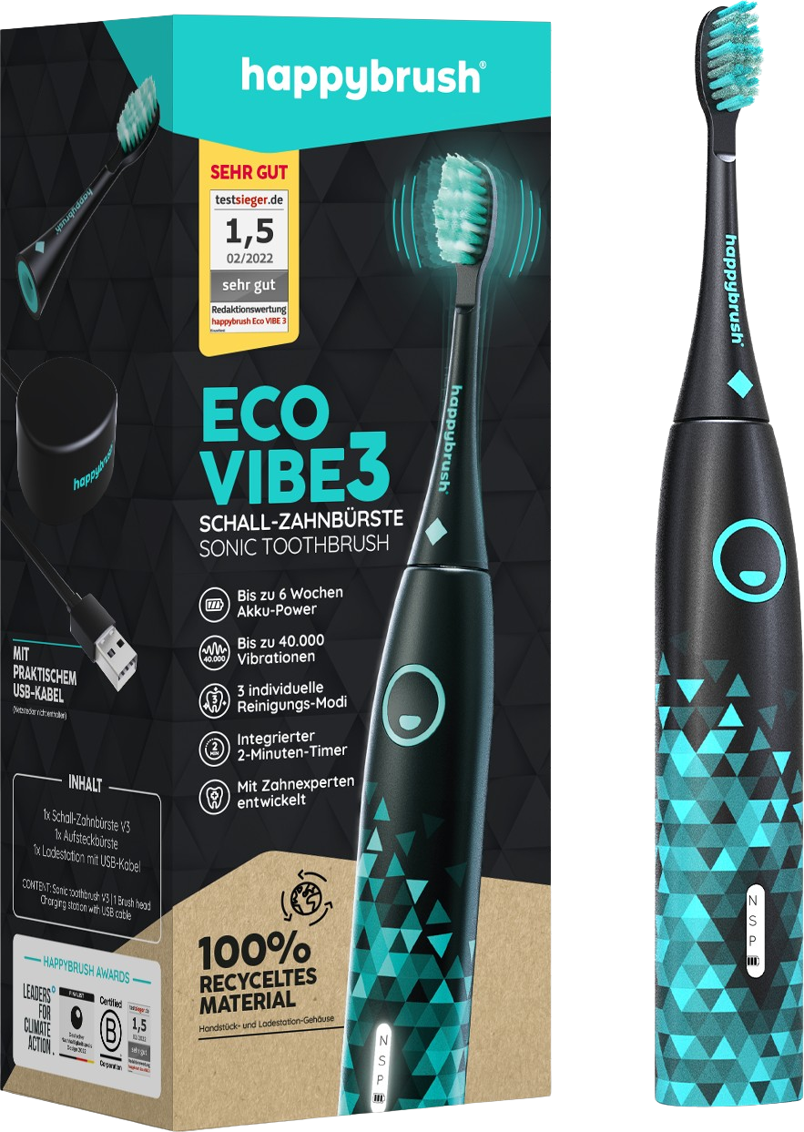 Trajnostna sonična zobna ščetka ECO VIBE 3 znamke happybrush je kot nalašč za tiste, ki imajo radi okolje in želijo odlično ustno higieno. Inovativne trojne ščetine globinsko očistijo zobe in masirajo dlesni. Vgrajen 2-minutni časovnik omogoča temeljito čiščenje, medtem ko se trije različni načini čiščenja prilagajajo vašim individualnim potrebam. Zmogljiva baterija zdrži do 6 tednov.