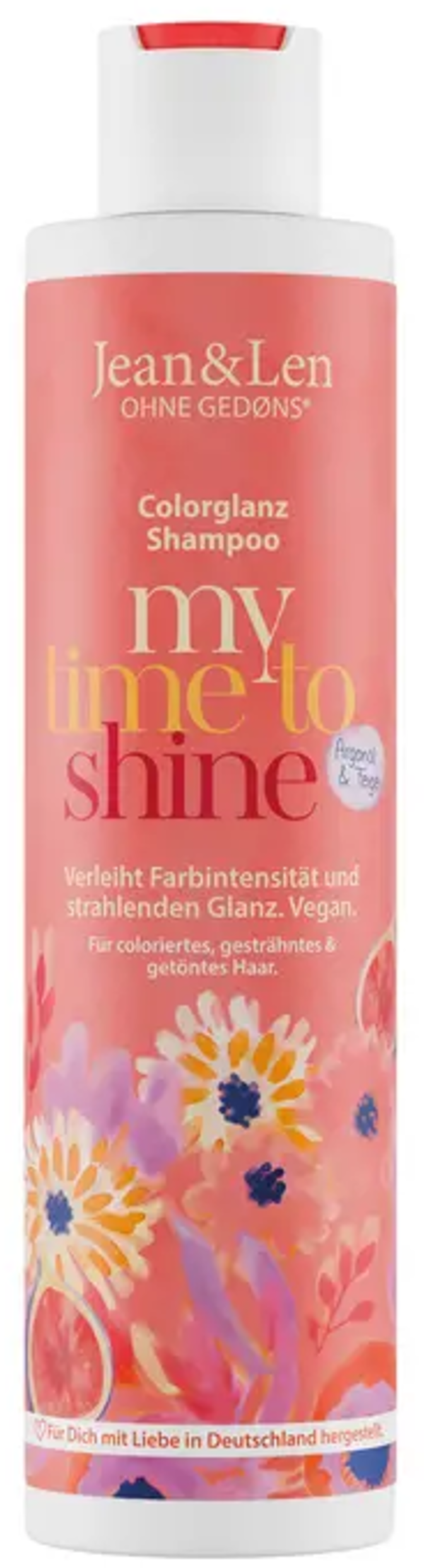 Barvani lasje bodo navdušeni nad tem šamponom! Colour Shine šampon z arganovim oljem in figami znamke Jean&Len zagotavlja sijaj in optimalno nego zaradi arganovega olja, izvlečka fig in vitamina E. Zaradi dragocenih sestavin so barvani, tonirani ali osvetljeni lasje deležni čudovite nege in novega sijaja. Sadno-svež vonj pa vas razvaja skozi celoten proces umivanja.