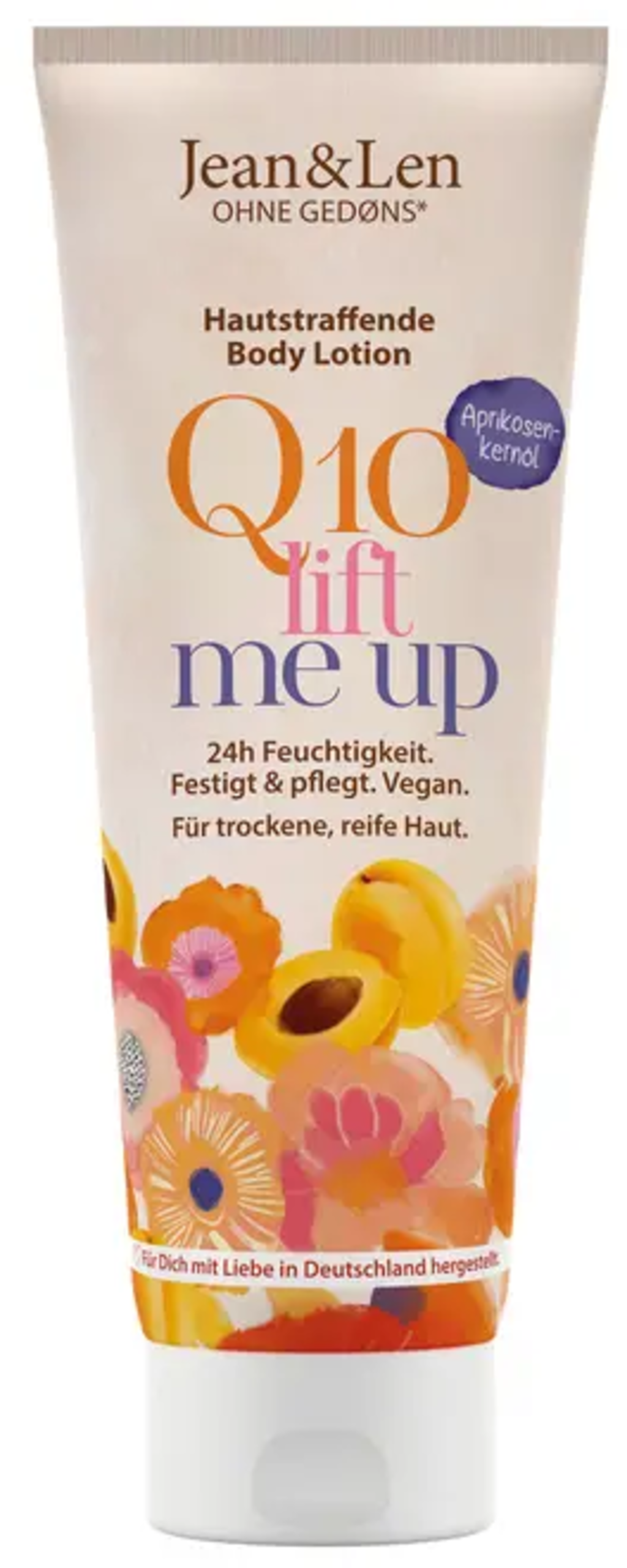 Starajoča se koža potrebuje ustrezno nego! S tem losjonom za telo znamke Jean&Len z oljem mareličnih jedrc in koenzimom Q10 lahko suhi, zreli koži zagotovite vse, kar potrebuje. Ta losjon za telo brez parabenov z osvežilnim vonjem limone vlaži kožo ter jo za dolgo časa naredi mehko in voljno. Poleg olja mareličnih koščic in koenzima Q10 vsebuje tudi rastlinski glicerin, vitamin E in karitejevo maslo – optimalna nega, prilagojena potrebam vaše kože.