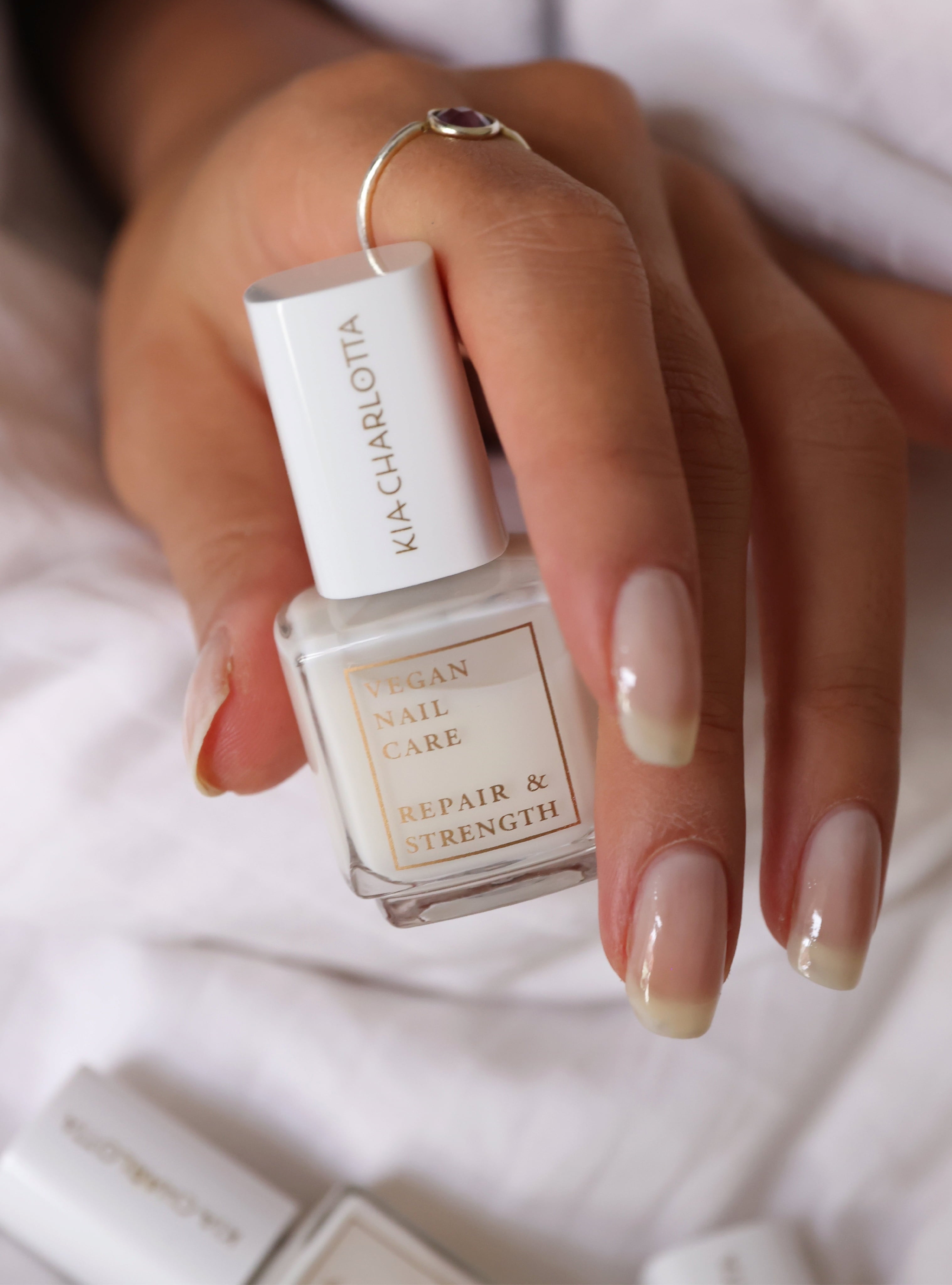 Repair & Strength utrjevalec s kaolinom znamke Kia-Charlotta daje vašim nohtom moč. S svojo bogato teksturo utrjevalec za nohte zapolni razpoke na površini nohtov in naredi vaše nohte močnejše. Veganska formula varuje okolje na najboljši možni način. Vaši nohti dobijo plemenit zaključek. Izgledajo sijoči in zdravi.