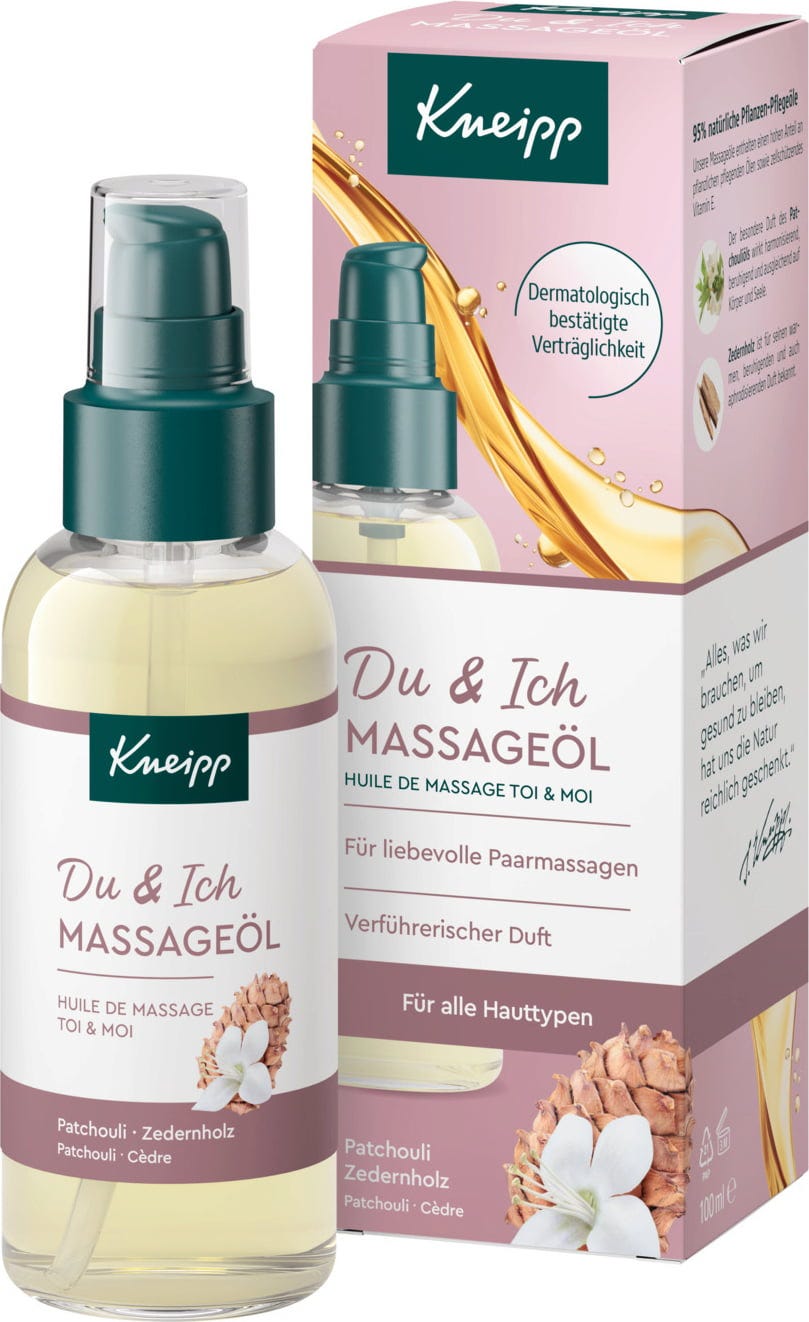Kneippovo masažno olje Du & Ich vsebuje negovalna rastlinska olja in naravna eterična olja iz lesa cedre in pačulija. Počasi se vpija v kožo in omogoča posebno prijetno masažno izkušnjo. Vitamin E tudi neguje kožo.
