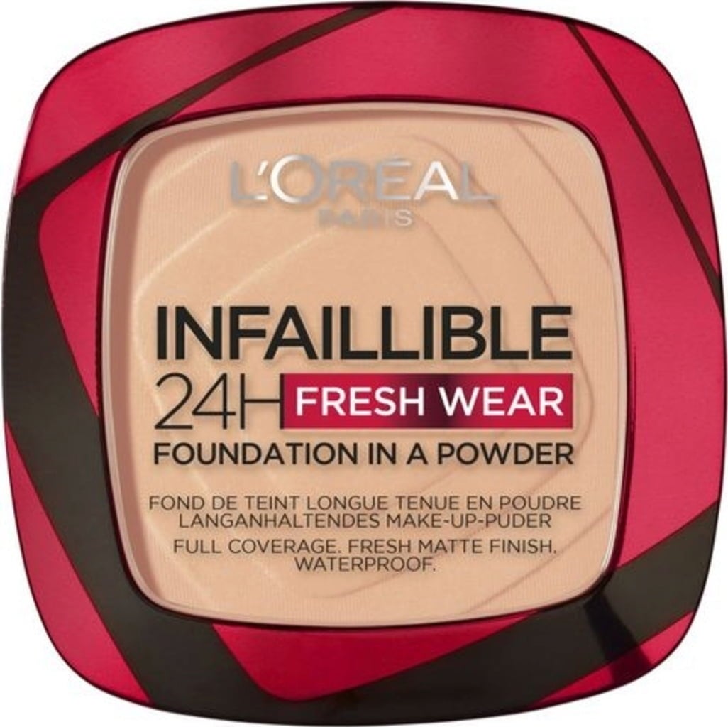 L'OREAL-ov puder Infaillible 24H Fresh Wear Make-Up prekriva kot podlaga in matira kot puder. Lahka tekstura je zračna in vaše kože ne izsuši. S svojimi dolgo obstojnimi pigmenti puder zagotavlja visoko prekrivnost, ki traja do 24 ur. Nežna tekstura ohranja visoko vlažnost ter je vodoodporna kot tudi odporna na znoj.