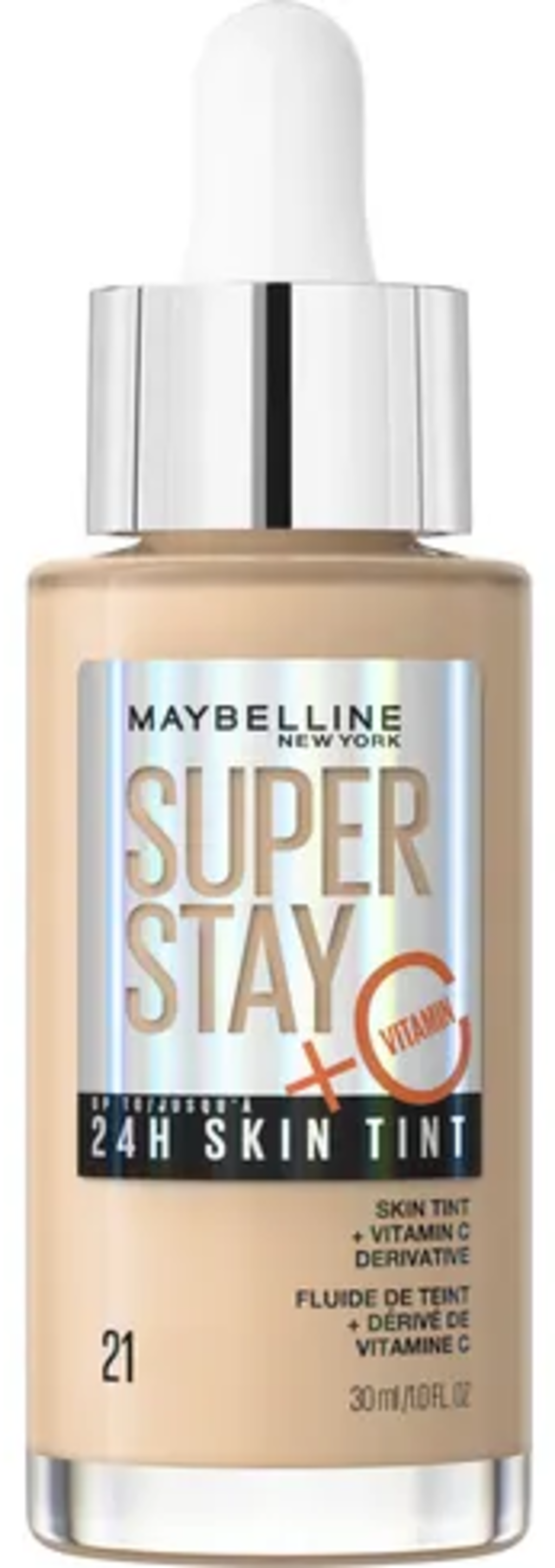 Super Stay 24H Skin Tint znamke Maybelline ima zaradi pigmentov, ki so podobni koži, blago do srednjo prekrivnost in omogoča ustvarjanje popolnoma naravnega make-up videza. Veganska formulacija izdelka je obogatena tudi z dragocenim vitaminom C, ki lahko zmanjša pigmentne madeže in poskrbi za sijočo polt. Brezskrben občutek na koži, ki ga zagotavlja Super Stay 24H Skin Tint traja do 24 ur.