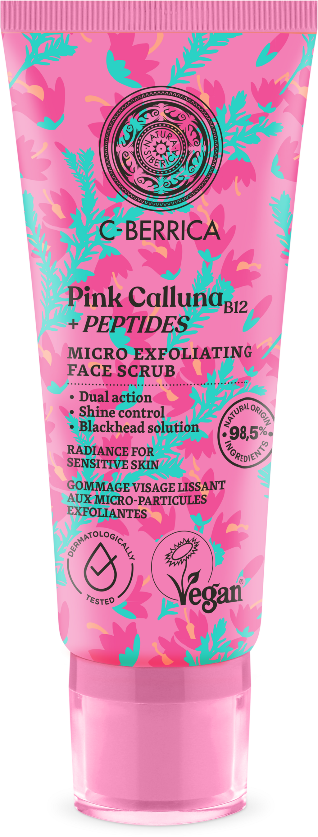 C-Berrica Micro Exfoliating Face Scrub Pink Calluna znamke Natura Siberica je nežen, veganski piling za obraz za občutljivo kožo, ki se idealno vključi v vašo vsakodnevno nege kože. Kremna tekstura združuje fine piling delce s prijetno nežno formulo, ki omogoča temeljito čiščenje obraza. Ob uporabi se odstranijo odmrle kožne celice, koža pa je v trenutku mehkejša na dotik. Piling je primeren za redno uporabo, saj opazno izboljša teksturo kože in poskrbi za negovan ter svež občutek.