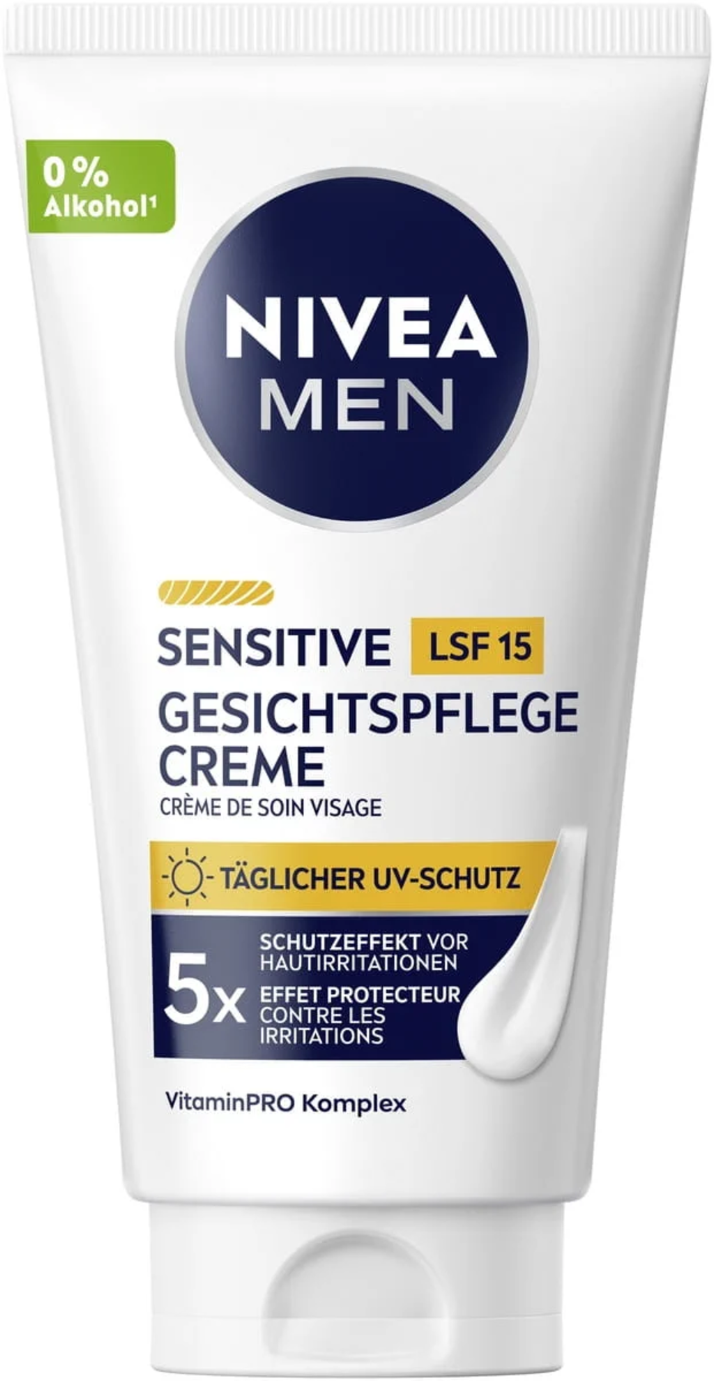 MEN Sensitive krema za obraz z ZF 15 znamke Nivea vsebuje blago sestavo za občutljivo moško kožo. Dolgotrajno in intenzivno vlaži suho kožo brez mastnih in neželenih ostankov. Z redno uporabo lahko pomagate podpirati naravno kožno pregrado in občutljivo kožo zaščitite pred vplivi okolja. Zaščitni faktor 15 deluje tudi kot zaščita pred UV-žarki. Idealna dnevna krema za vsakodnevno vlaženje in nego.
