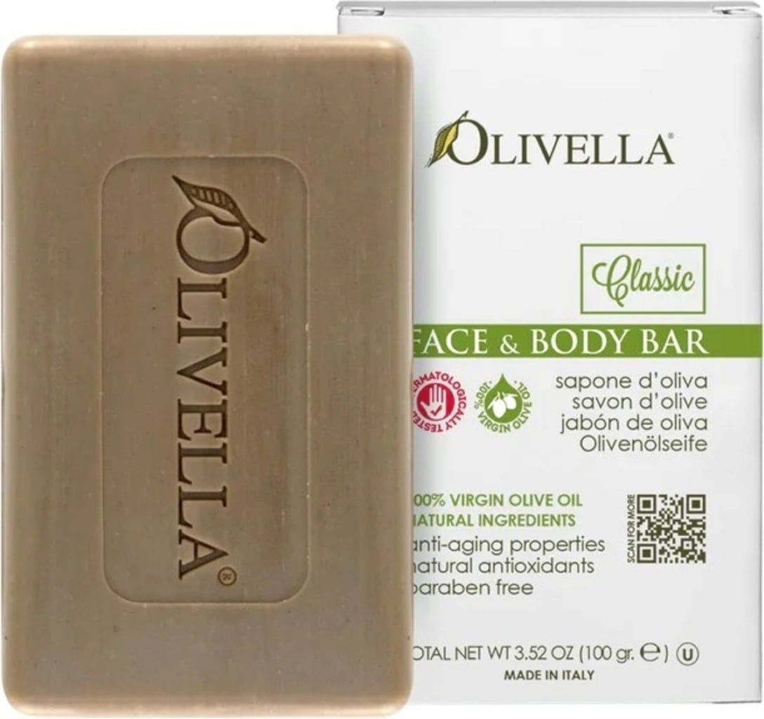 Klasično trdo milo iz oljčnega olja znamke Olivella nežno očisti kožo in jo nahrani. Njegova naravna formula, narejena z deviškim olivnim oljem, spodbuja prožnost kože. Idealno je za vsakodnevno uporabo in je primerno tudi za občutljivo kožo. Milo ne vsebuje palmovega olja in vas razvaja z nežnim mediteranskim vonjem.