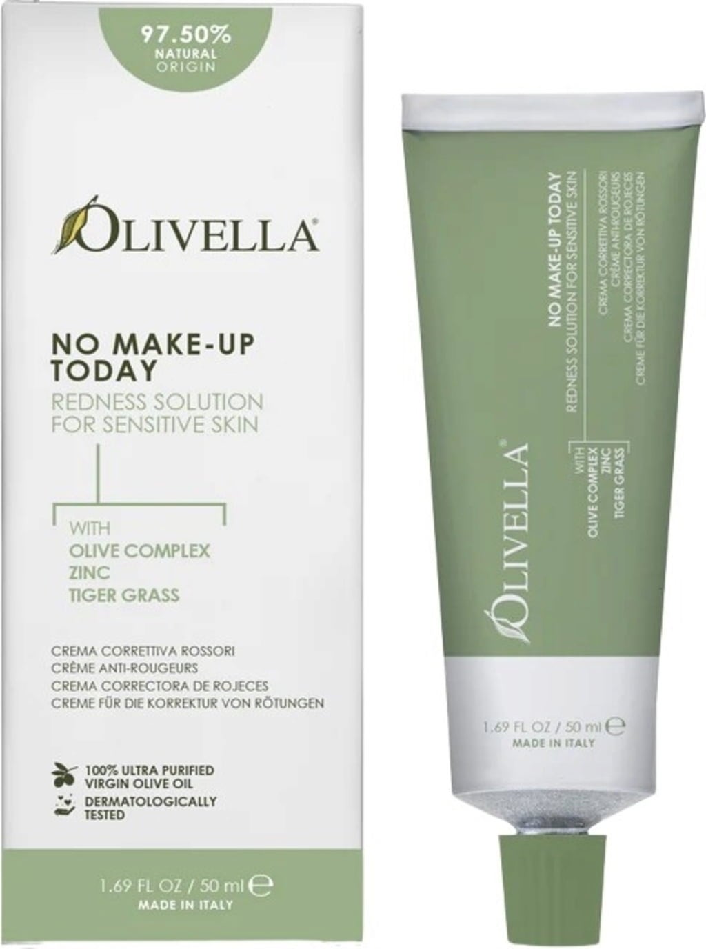 Korekcijska krema za obraz znamke Olivella nežno uravnava rdečico in obarvanost kože. Obogatena je z ekstra deviškim oljčnim oljem, cinkovim oksidom, gotu kolo, rdečimi algami in mešanico mineralnih pigmentov. Svetlo zelena tekstura se popolnoma prilagodi polti in poskrbi za enakomeren videz. Krema je idealna za občutljivo kožo in kot podlaga za ličila. Formulacija ne vsebuje dišav.