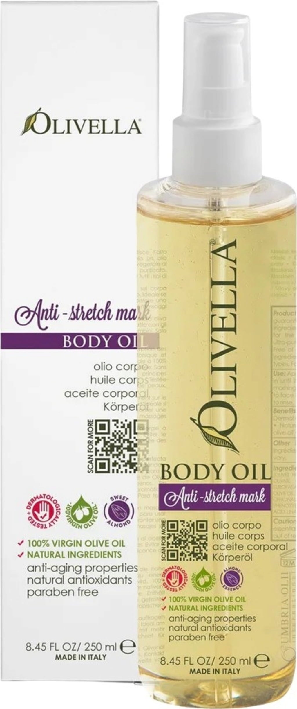 Olje za telo znamke Olivella pomaga pri odpravljanju strij, zato je idealno za nosečnice, ženske po porodu in vse, pri katerih so se po spremembi telesne teže pojavile strije. Formula brez parabenov je obogatena z oljčnim oljem ter eteričnima oljema sladkega mandlja in sladke pomaranče, ki koži zagotavljajo dragoceno vlago in spodbujajo občutek elastičnosti.