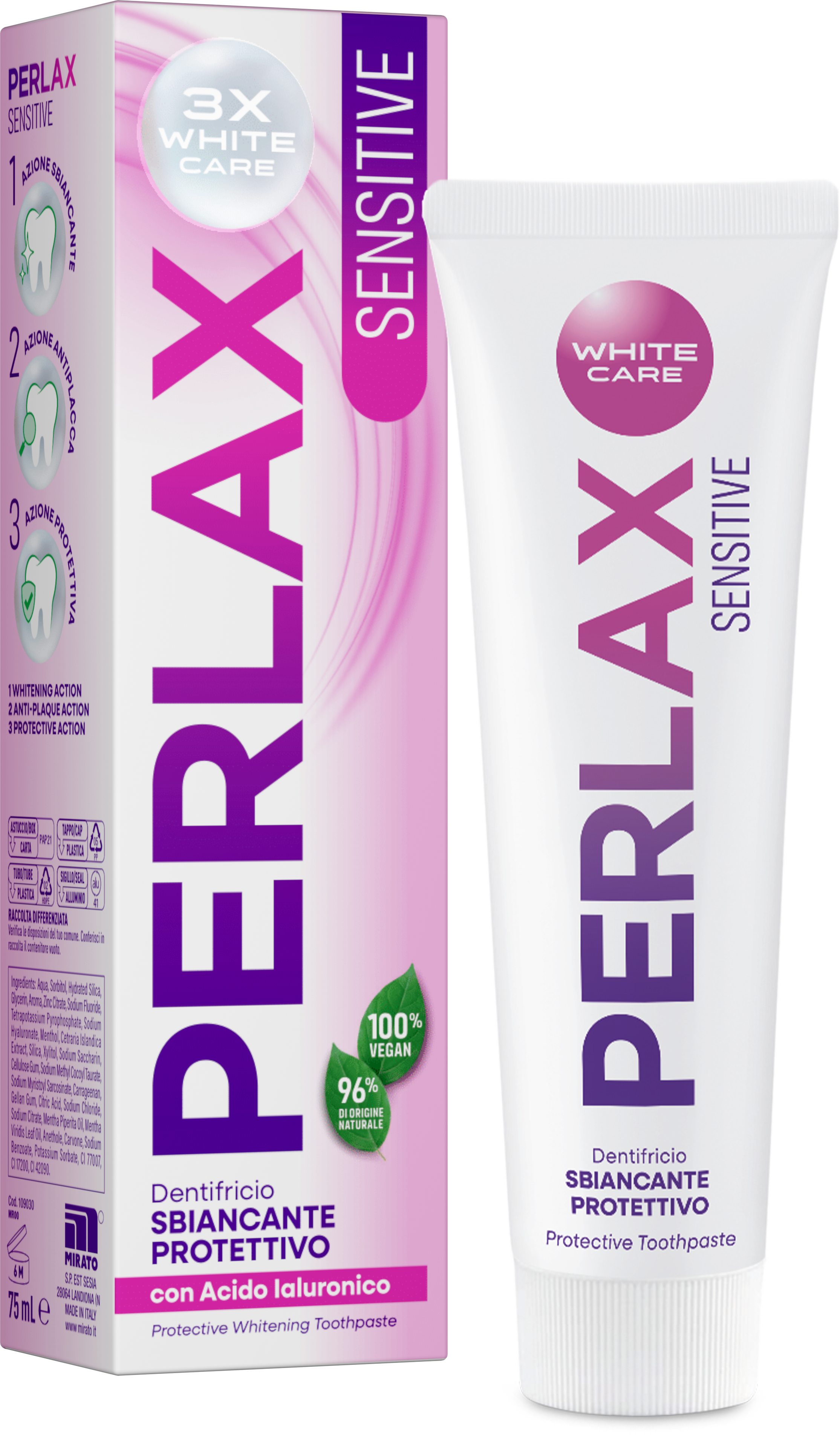 Veganska zobna pasta Sensitive znamke Perlax združuje nežno čiščenje zob in učinkovito nego, posebej za občutljive zobe in dlesni. Kombinacija hialuronske kisline, mikrokapsul mentola in islandskega lišaja zagotavlja nežno podporo proti zobnim oblogam, natrijev fluorid pa pomaga pri remineralizaciji zobne sklenine.