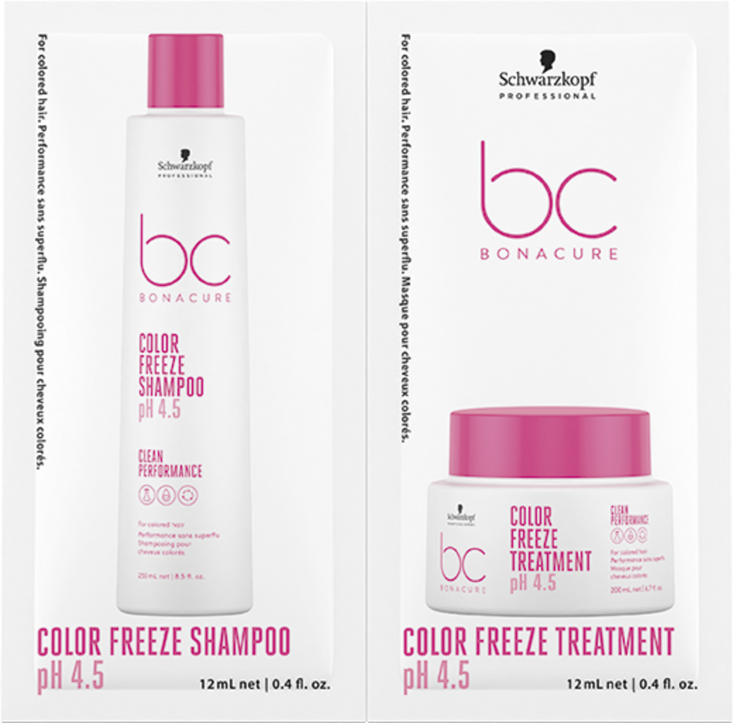 Želite svojim barvanim lasem zagotoviti ciljno nego za dolgotrajen sijaj barve? Vrečka Bonacure Color Freeze Duo Sachet znamke Schwarzkopf Professional je popolna rešitev za enkratno uporabo! Vsebuje nežen Color Freeze šampon in intenzivni obnovitveni tretma, ki sta posebej razvita za potrebe barvanih las.