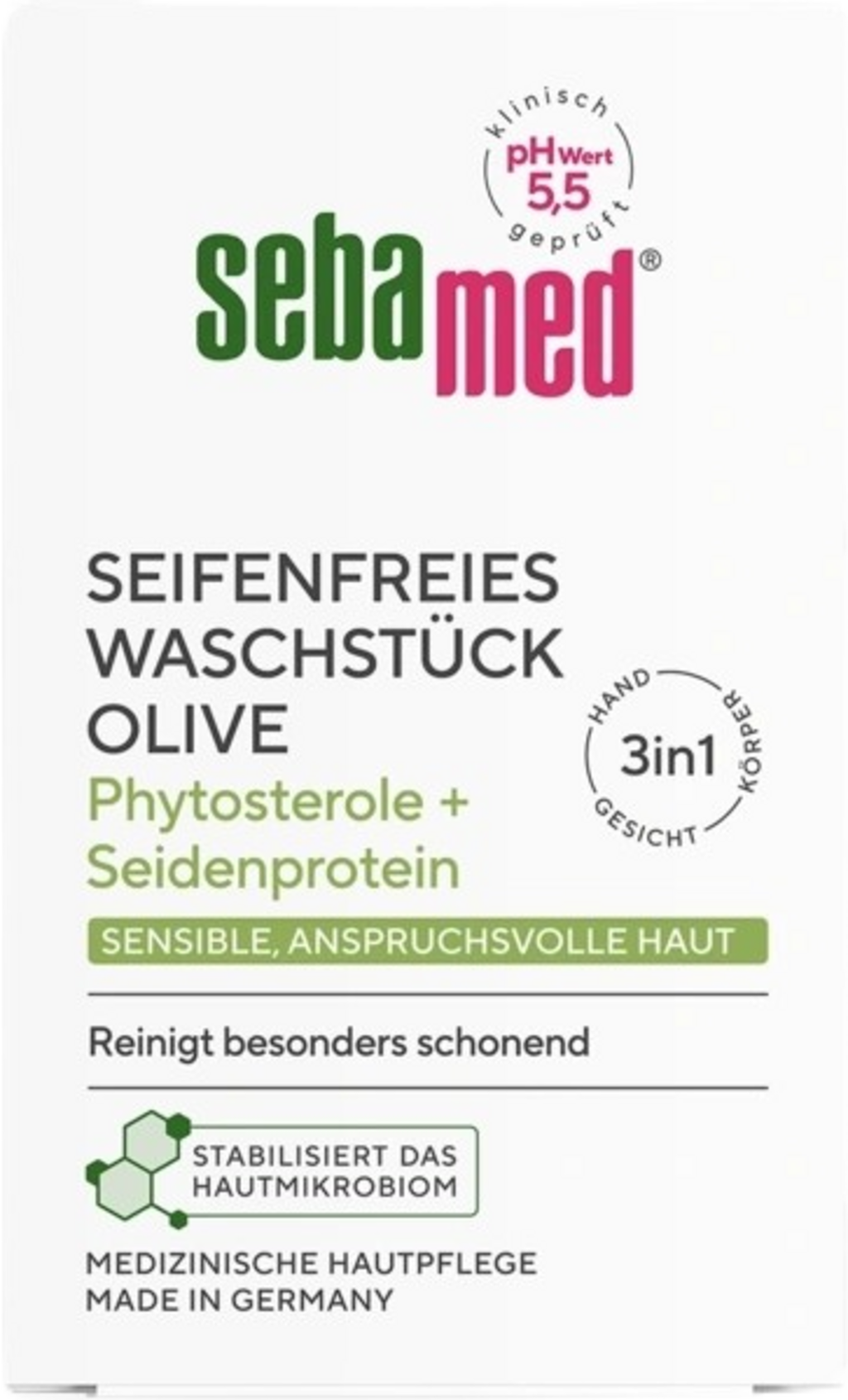 Trdo sredstvo za umivanje brez mila z olivnim oljem znamke sebamed nežno očisti občutljivo in problematično kožo ter zagotavlja pomembno vlažnost. Trojni negovalni kompleks fitosterolov, proteinov svile in oljčnega olja lahko prepreči izsušitev kože in podpira prijeten občutek na koži.