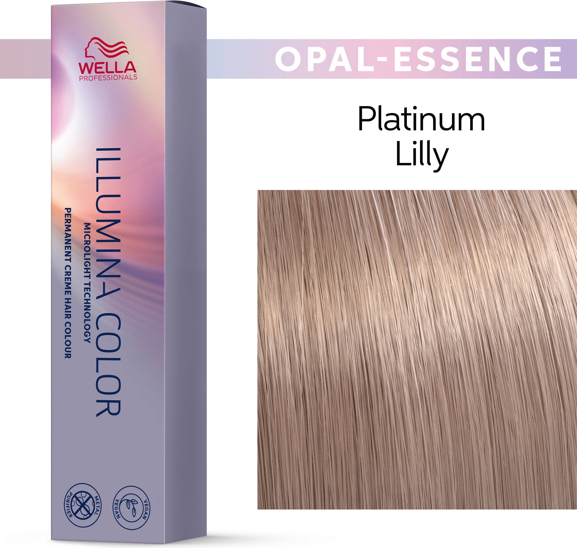 Ilumina Color Opal Essence Wella Professionals vaše lase pokaže v novi luči. Opalescentni odtenki brez globine dajejo kovinsko mlečno bleščanje z naravnimi toplimi in hladnimi odsevi svetlobe. Sam ali v mešanici z Illumina Color, Opal Essence odpira nova področja barv. Rezultat je intenzivnejši na svetlejših laseh. Naslednji odtenki nežno posvetlijo naravno ali umetno barvo las: