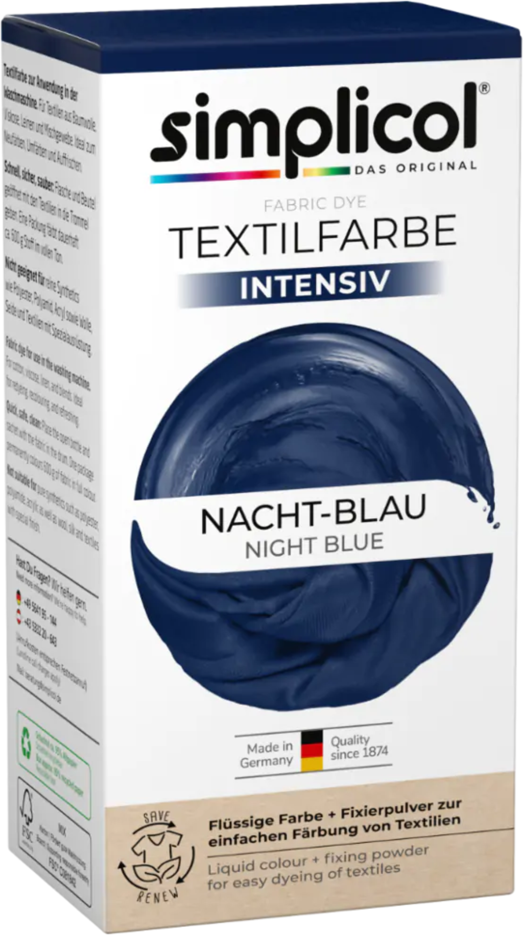 Barvanje, prebarvanje ali osvežitev tekstila je preprosto z barvami za tekstil Intensiv znamke simplicol. Tekoče barvilo se doda v boben pralnega stroja, kar omogoča enakomerno porazdelitev barve. Rezultat: vaša najljubša oblačila v briljantnih, intenzivnih barvah!