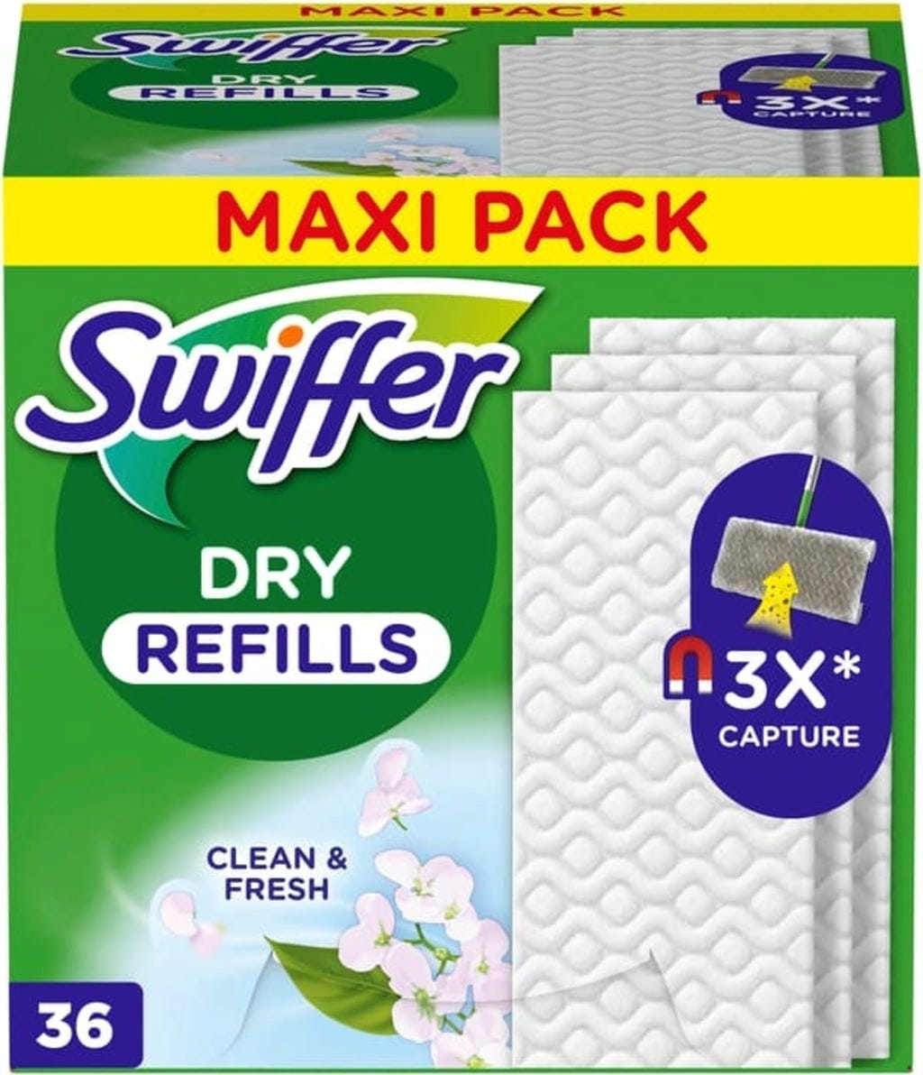 S krpami za suho brisanje tal znamke Swiffer lahko hitro in suho očistite tla ter odstranite prah, dlake (hišnih ljubljenčkov) in delce, ne da bi pri tem za sabo pustili kakšne sledi. Suhe krpe pritrdite na nastavek na brisanje tal na Swiffer ročaju in že ste pripravljeni na delo. Vlakna z edinstveno 3D strukturo vpijejo do 3-krat več umazanije, prahu in dlak ter zadržijo zbrano umazanijo zahvaljujoč magnetnemu učinku. Idealno za brisanje vseh talnih površin.