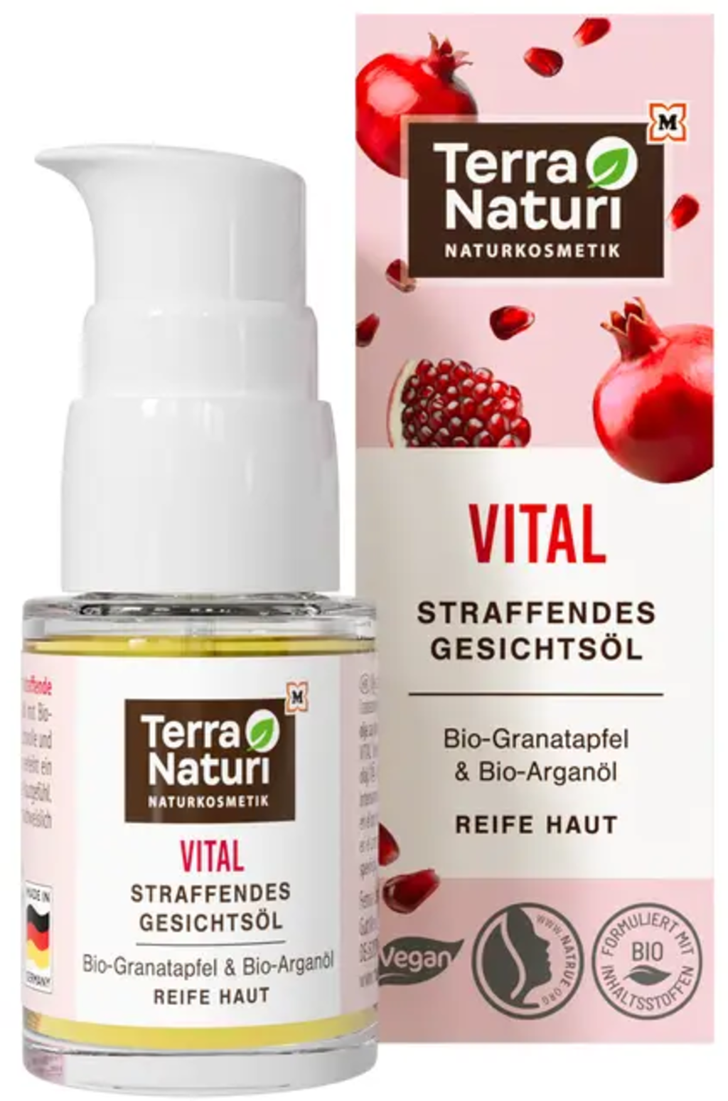VITAL učvrstitveno olje za obraz znamke Terra Naturi posebej neguje zrelo in zahtevno kožo. Z bio oljem granatnega jabolka in bio arganovim oljem kožo čudovito nahrani in zgladi ter ji daje svilnat in udoben občutek.