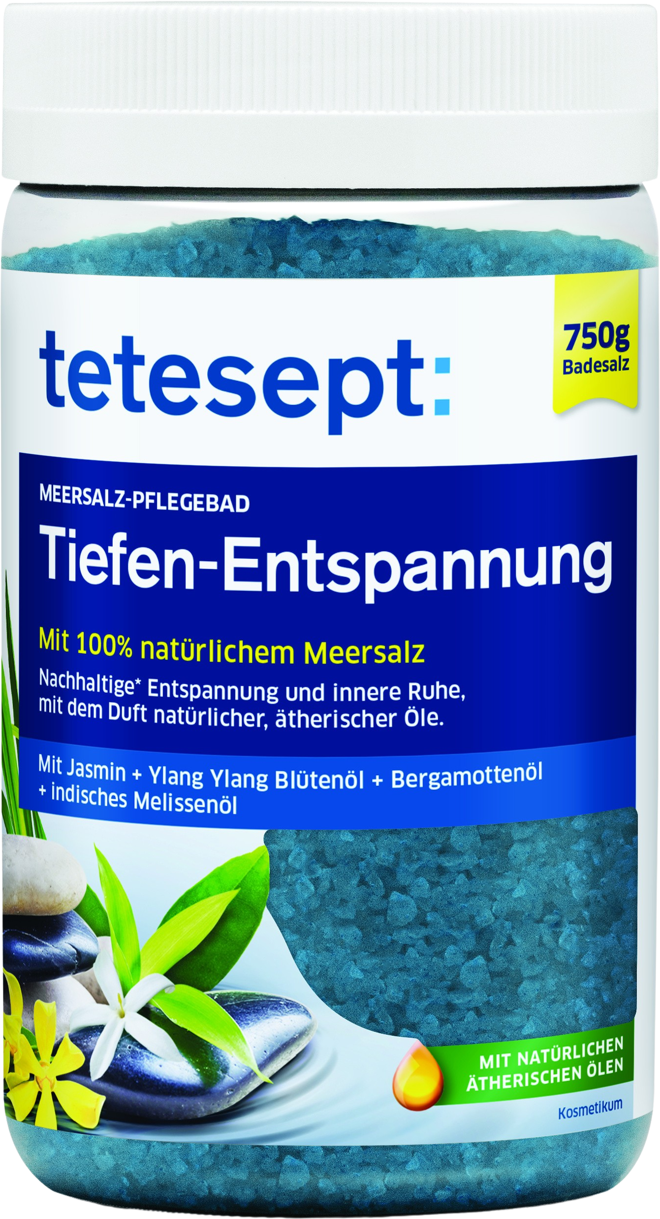 Topla kopel je idealna, če želite pozabiti za stresen dan. Globoka sprostitvena morska sol znamke tetesept je popolno dopolnilo. Naravno čista morska sol in naravna eterična olja bergamotke, indijske melise, ylang-ylanga, sivke in pomaranče zagotavljajo čudovit vonj, ki ga dopolnjuje izvleček jasmina. Veganska formulacija prav tako ne vsebuje mikroplastike.