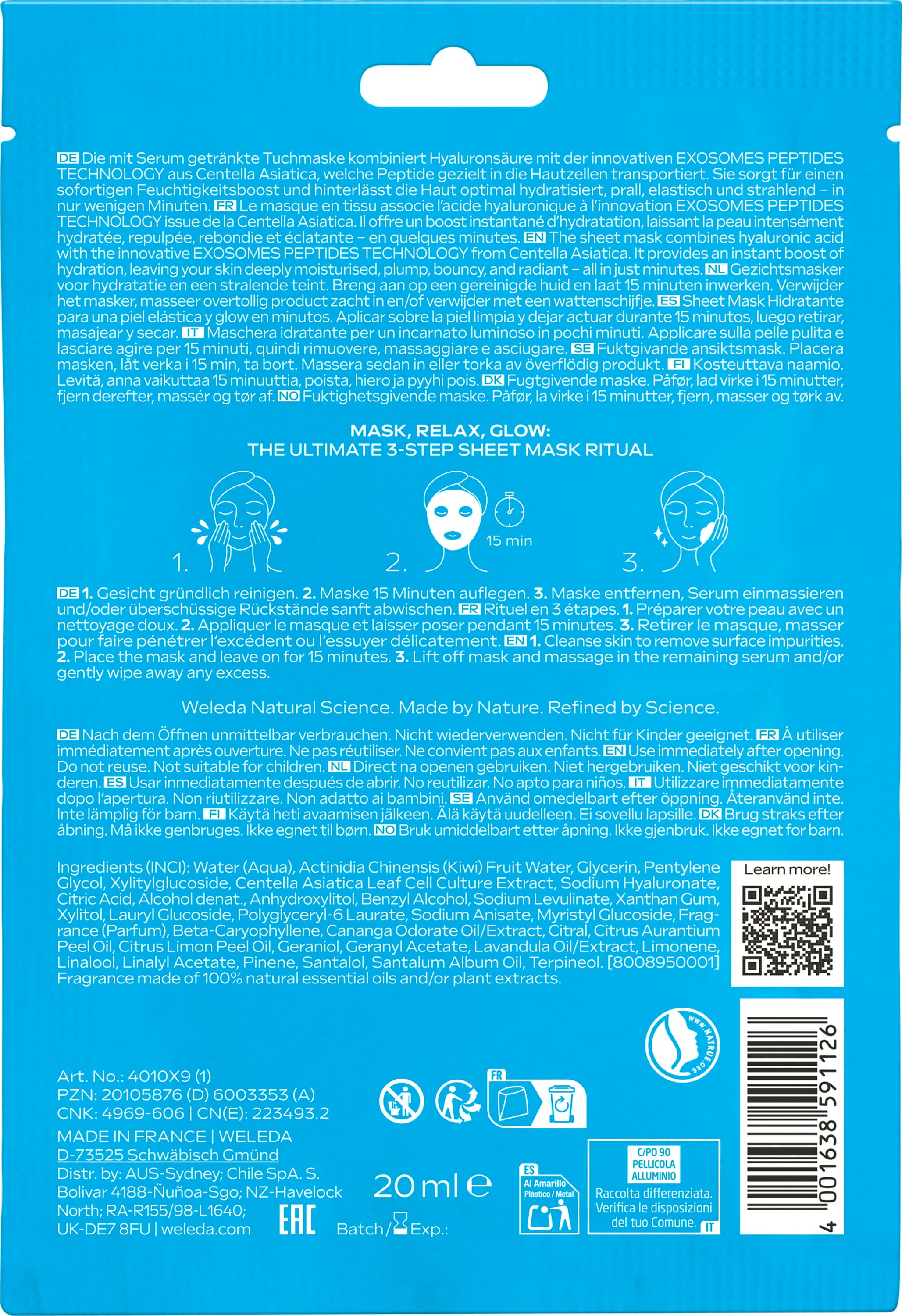 Inovativna tehnologija EXOSOME peptidov, ki temelji na rastlini Centella Asiatica, je v tej maski združena s hialuronsko kislino. To ne le dovaja peptide neposredno v kožne celice, temveč zagotavlja tudi intenzivno hidratacijo, kar ima za posledico optimalno hidrirano, polno, elastično in sijočo kožo.