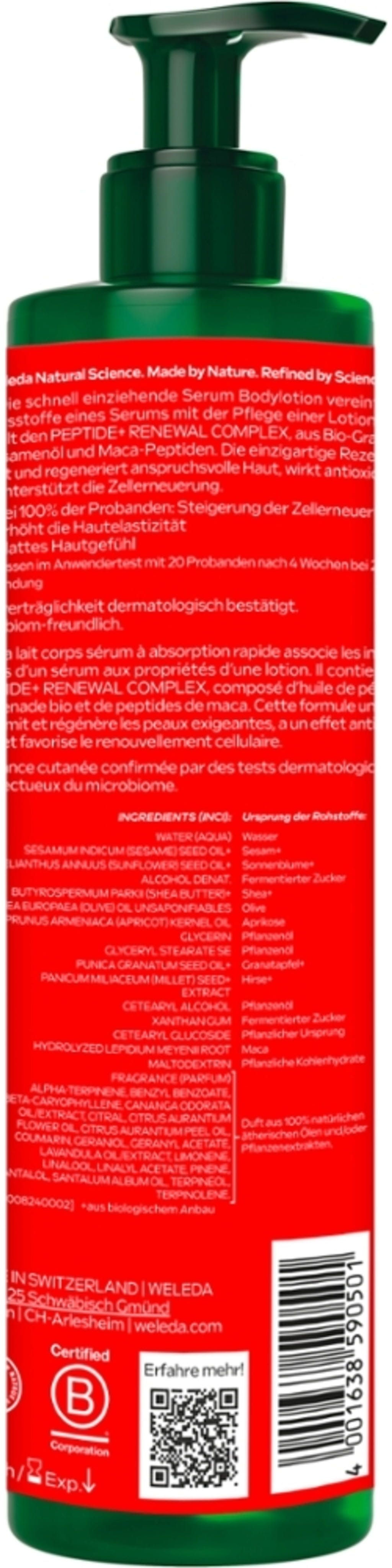 Ta posebni losjon za telo združuje sestavo seruma in teksturo losjona. Formula vsebuje PEPTIDE+ RENEWAL COMPLEX znamke Weledas z maca peptidi in oljem iz bio semen granatnega jabolka. Losjon ima tako učvrščevalne in gladilne lastnosti ter podpira elastičnost kože.