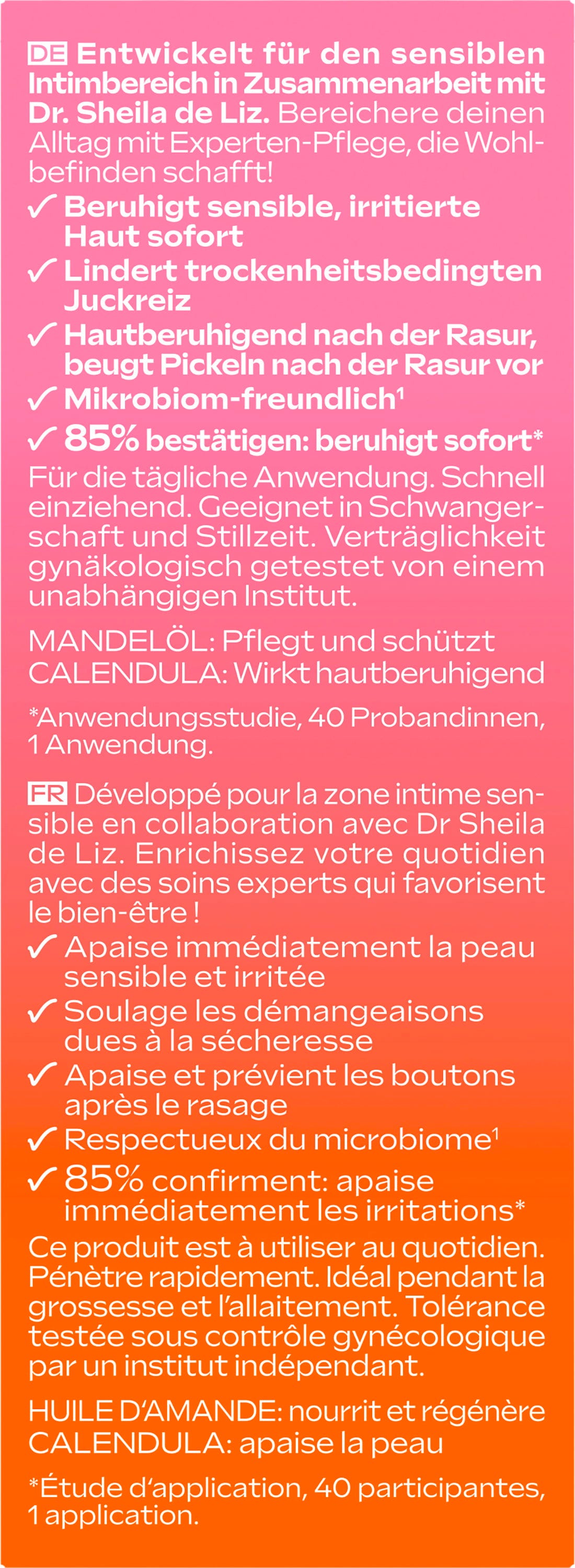 V sodelovanju s strokovnjakinjo Dr. Sheilo de Liz so bili razviti posebej za občutljivo intimno področje, zato so vlora Dodatno pomirjujoče kapljice idealni za vsakodnevno nego. Zahvaljujoč svoji mikrobom prijazni formuli izdelek zmanjšuje občutek suhosti in je primeren za nego po britju.
